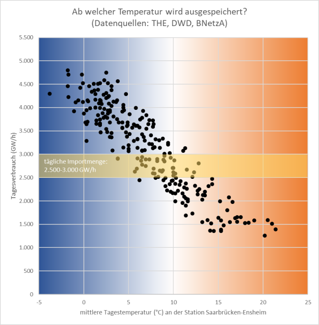2. Ab welcher Temperatur wird mehr verbraucht, als importiert wird, sodass die Speicher angezapft werden?